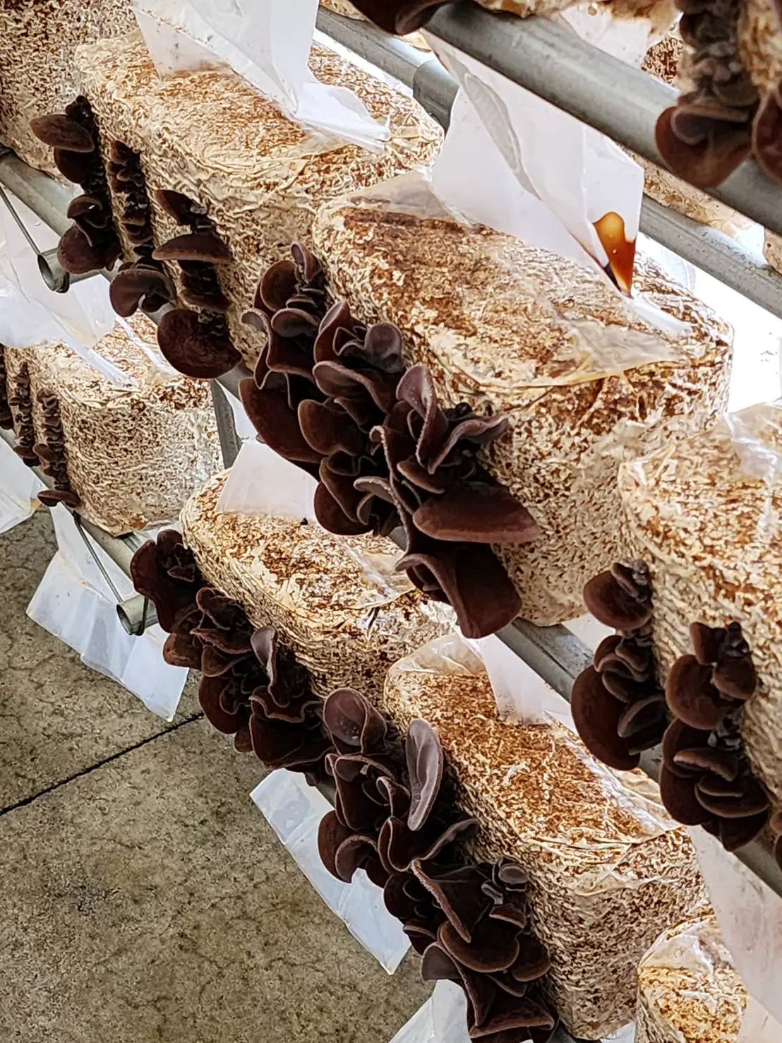 全天候型ハウス内で、厳選された国産菌床を使用し無農薬で育てています。江田島の地下水を使い、灌水設備による自動散水で水分管理を徹底。安心安全なきくらげ作りを追求し続けています。